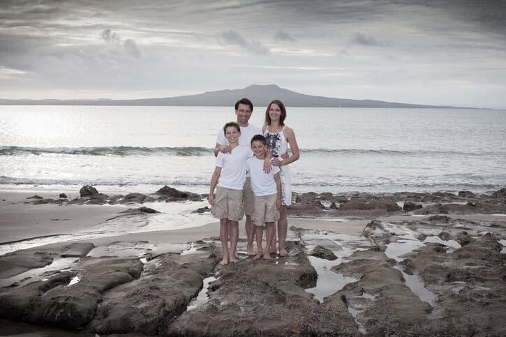 Classic family portrait at the beach with Rangitoto as an iconic Auckland symbol in the background – desaturated finish!